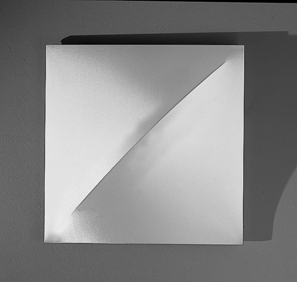 Wall or ceiling lamp with one arch, diffused light, available in four dimensions. Body in withe painted metal. Diffuser washable in white elasticized fabric.