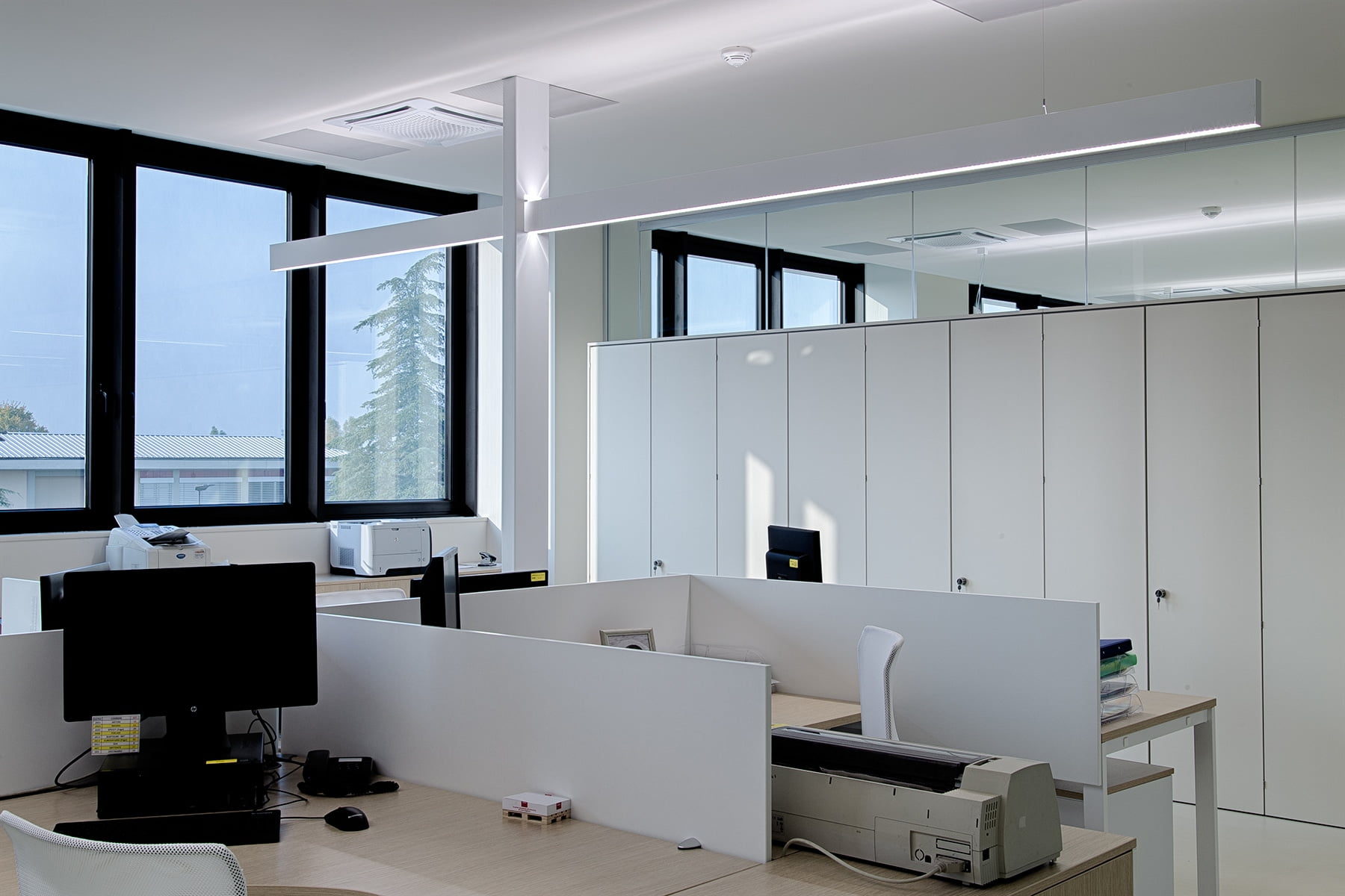 LED linear light sources, battens for T16 and T16 seamless fluorescent lamps and max 16A 3-circuit track modules for inclusion of projectors. Fluorescent battens, complete with 50/60 Hz 230/240 V electronic power supply, LED batten driver included. To be completed with side end caps with Light Proof system, opal white or microprismatic PC diffusing screen (in accordance with EN 12464-1), closing profiles, with a predefined length or cut to measure, or dark-light aluminium grille with high specular qualities and mounting brackets or suspension cables. IP20 or IP40 protection rating.