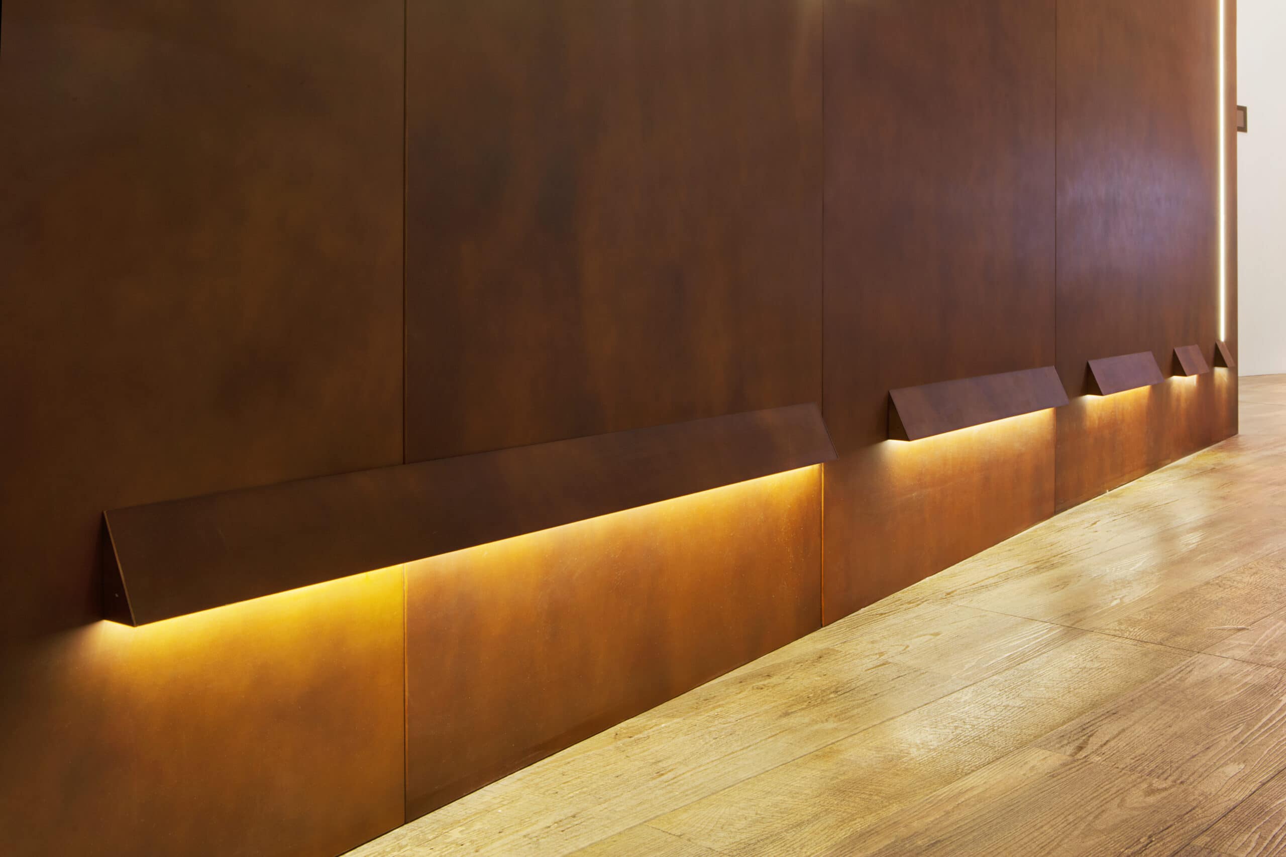 Wall-mounted modular system for direct or indirect lighting, made of painted empty extruded aluminium profiles complete with opal white polycarbonate diffusers, available in predefined lengths or cut to measure. Double installation possibility: if fixed by the narrow side, the lighting effect is diffused, if fixed instead by the wide side, the lighting is grazing. To be completed with LED strips, driver (to be installed remote), Light Proof closure heads and linear and angular joints. Degree of protection IP40, IP65.