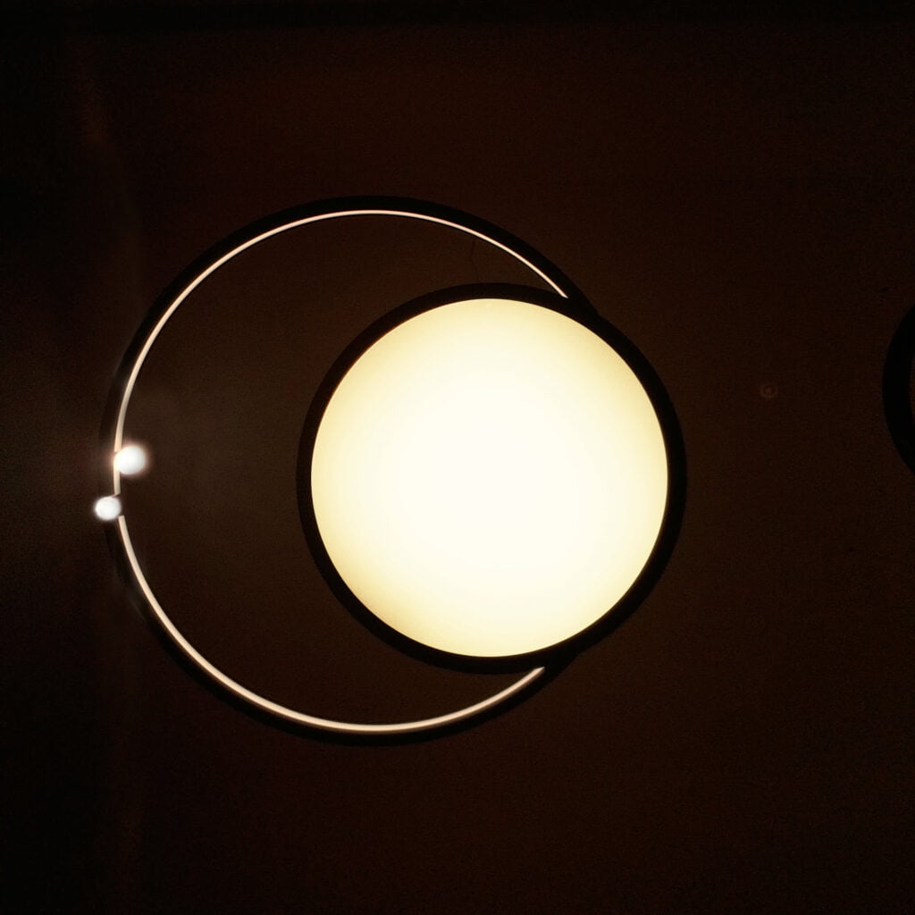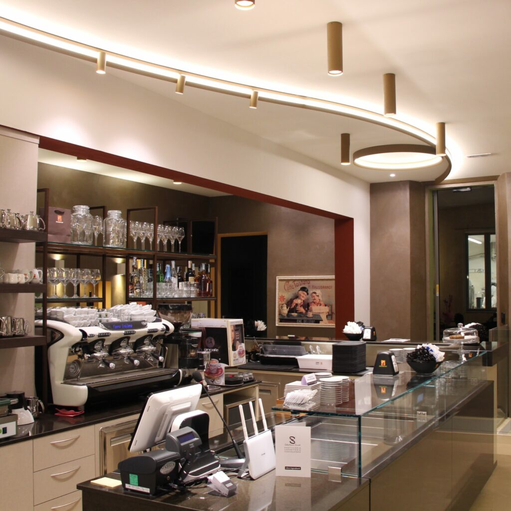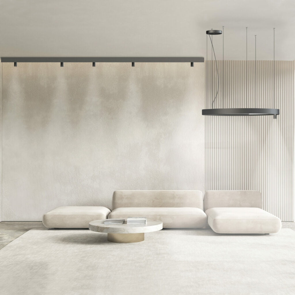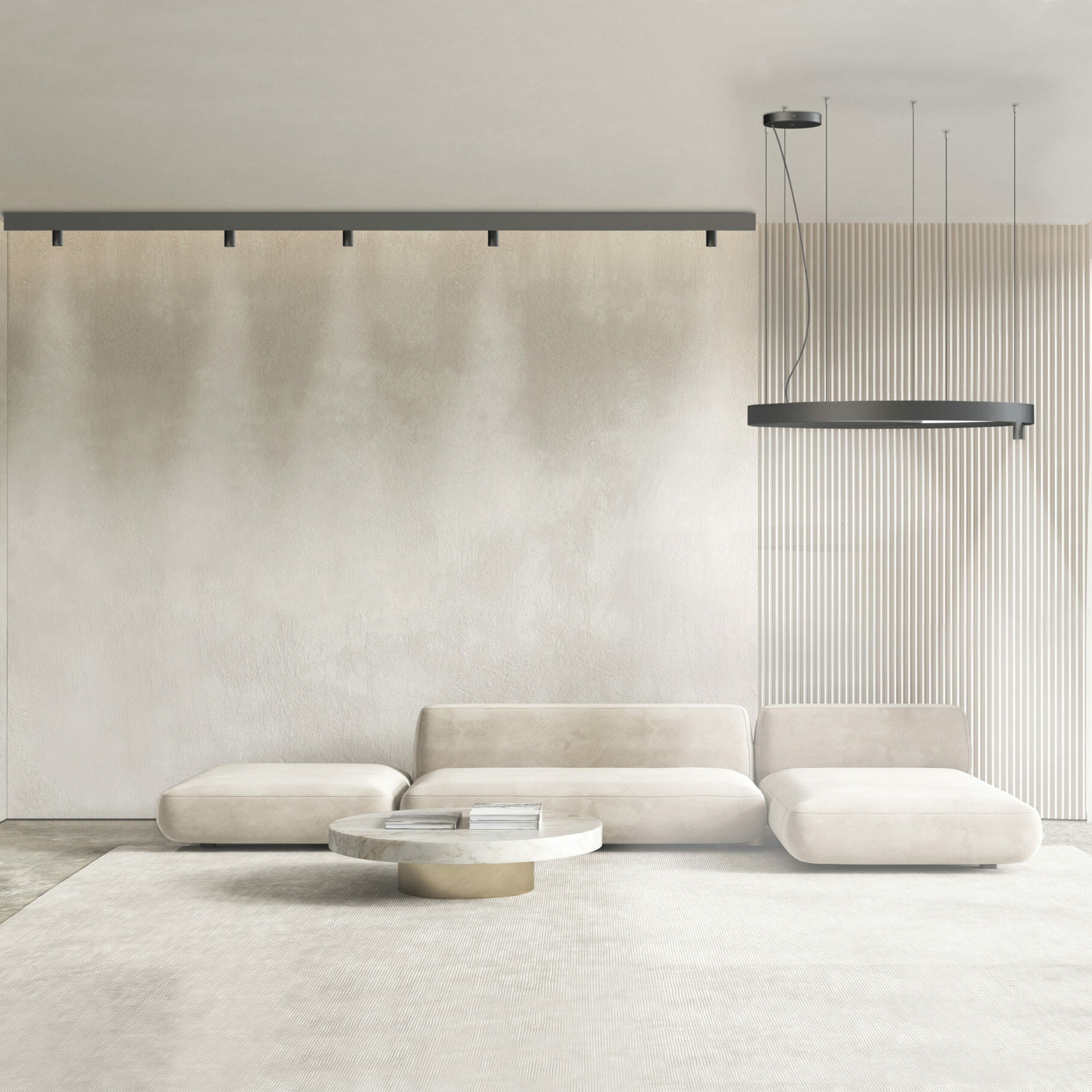 Extruded aluminum curved profiles programme. Profile dimensions: 90 x 30 mm and radius 367 mm – 517 mm – 667 mm Available in round suspended, ceiling-mounted and trimless recessed versions (default modules), in arc-shaped wall-mounted version (default module), or as modules to assemble together to form a sinusoidal system, ceiling-mounted or suspended. Available with the following lighting emissions:horizontal from the internal or external side of the profile, direct/diffused and indirect, provided by strip led (driver to be installed remote in a separate ceiling canopy or onto the false-ceiling) or by led batten with integrated driver (on direct/diffused lighting emission only). Opal white polycarbonate diffuser. The profile can be integrated with chip on board led adjustable projectors (remote driver), to be hung to the on the profile. Degree of protection IP40/IP43.