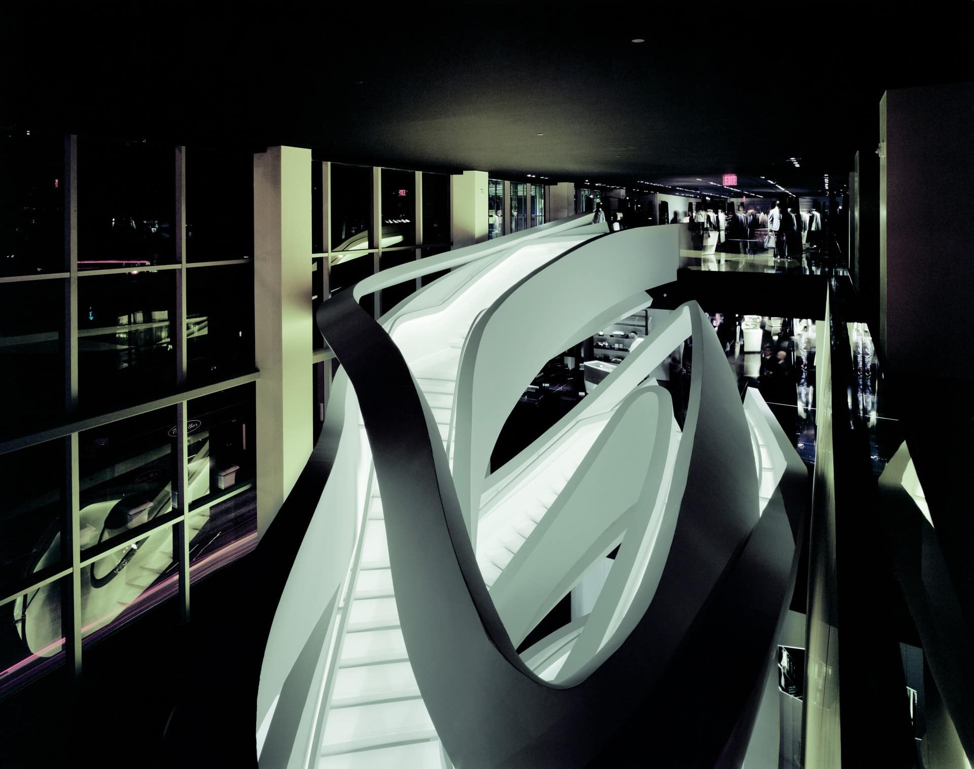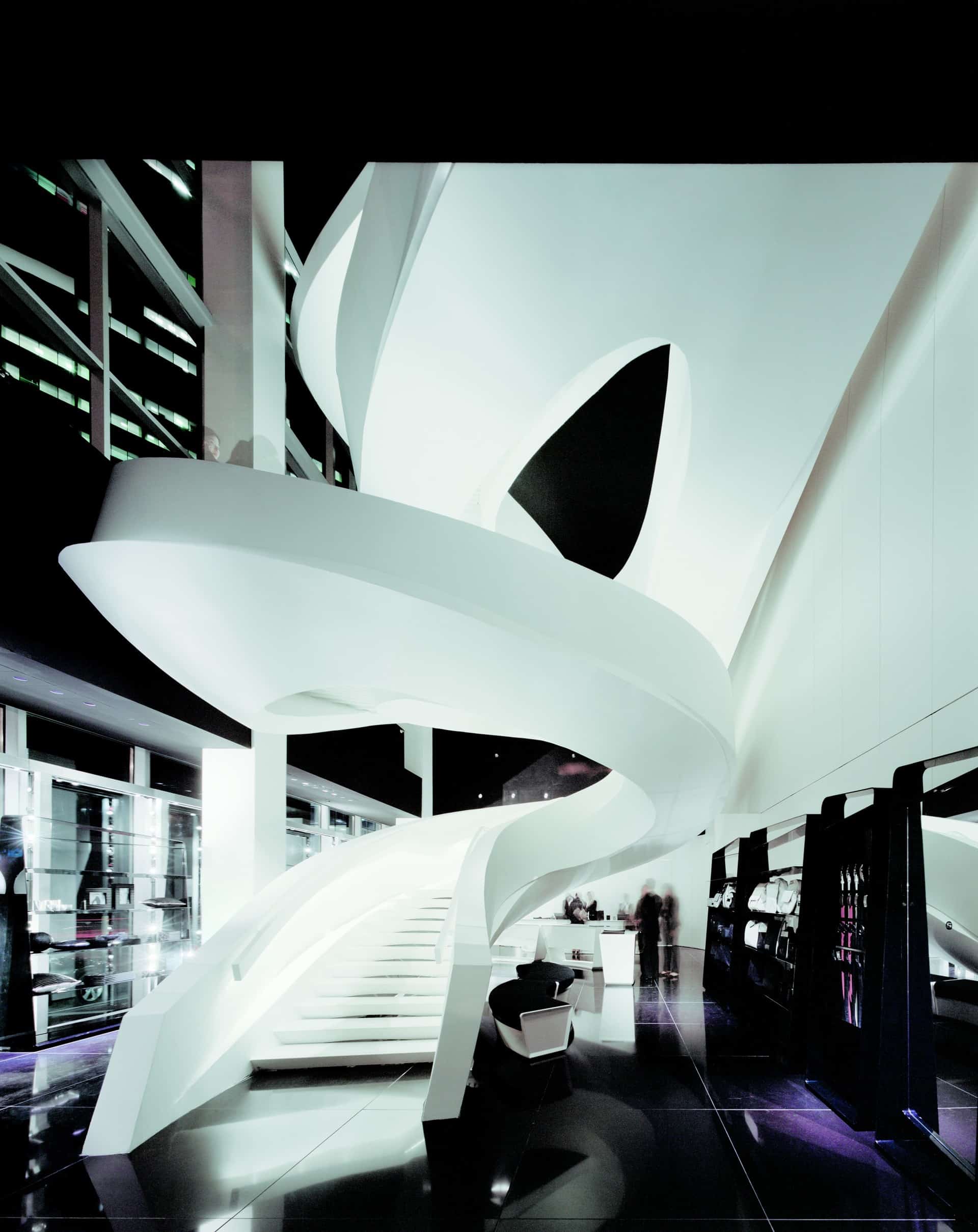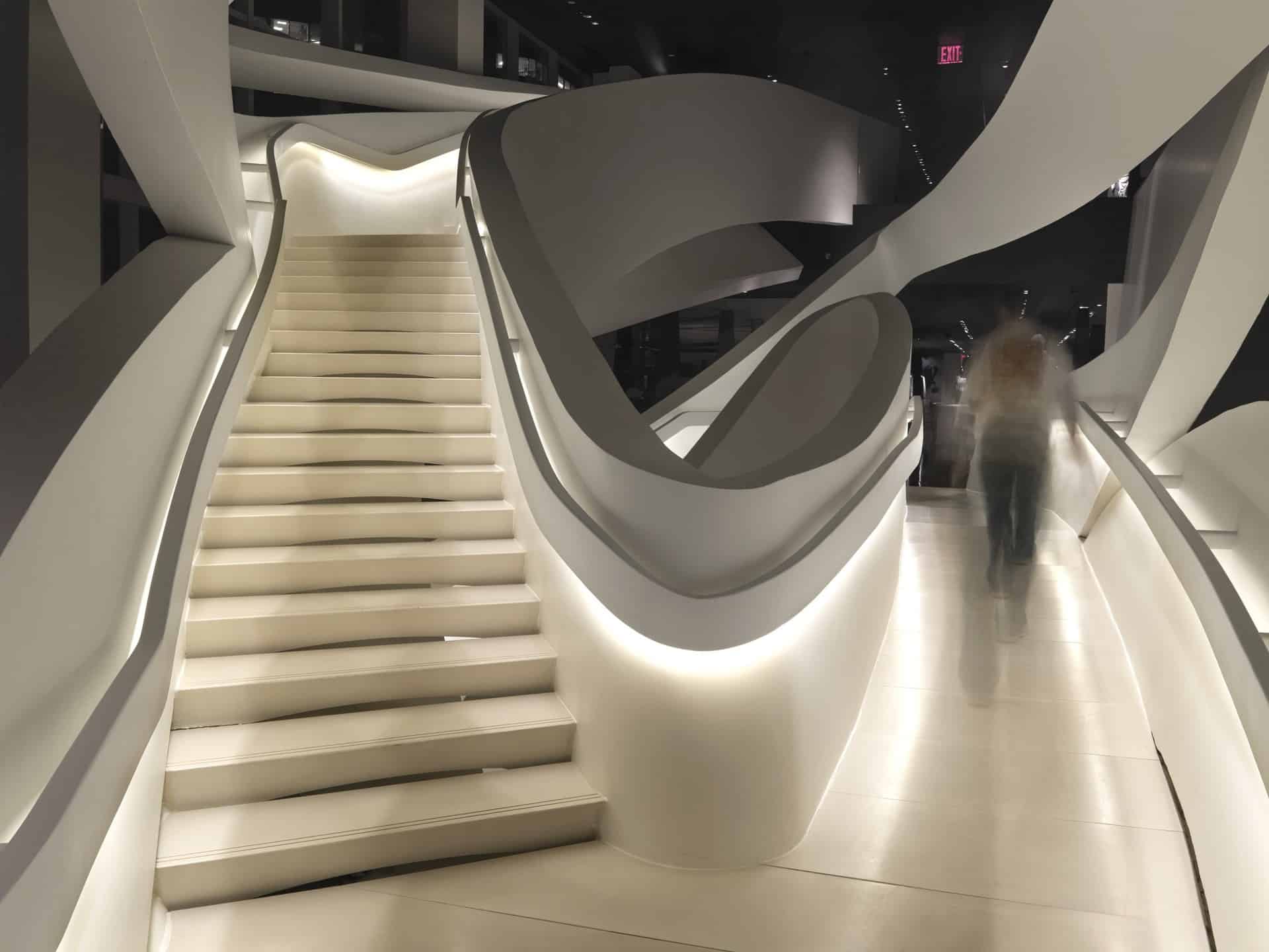 Situated in the centre of New York, in one of the world’s well known streets, the project takes up the first three floors of the two buildings located between 5th Avenue and 56th Street. Besides the basement, the showroom develops on four different levels and it is conceived as a single space, without clear distinctions, a space in harmony connected with the power generated by the vortex that is the staircase........http://it.archello.com/en/project/armani-fifth-avenue/3070885