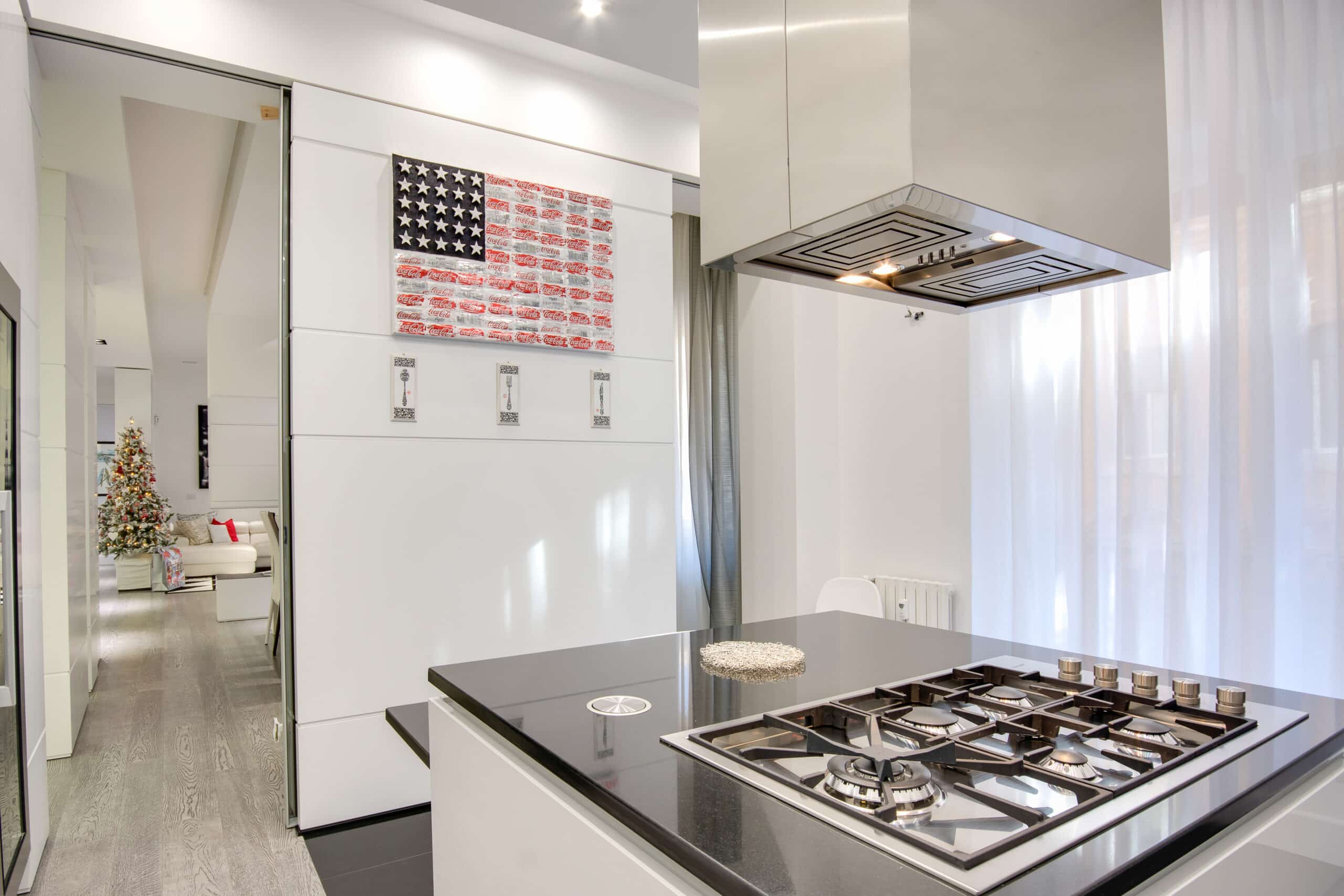 The apartment is located in a very exclusive neighbourhood of Rome. The brief was to give the house a "loft effect" where spaces were separated not by walls but by furniture. So the idea was to have a single area hosting multiple activities. As soon as you enter there is a feeling of a great bright and open space, minimalist areas and furniture and large sunny windows but everything in balance. Lighting design was very important throughout the planning of the apartment – games of shadows, chiaroscuro and bright light. The lighting becomes the focus of attention of the ceilings, deliberately black to emphasise the contrast. A recessed black line of the GUIDE series (made to measure to lead company Lucifero's design) cuts into the false ceiling over the dining table running along the 4.5 metres of the room and bending sharply vertically along the suspended volume of the tv/fireplace area. The units mounted flush with the ceiling (INCAS M) are from the same black line series and are installed in the living room and entrance, and placed at strategic points to illuminate works of art inside the apartment.