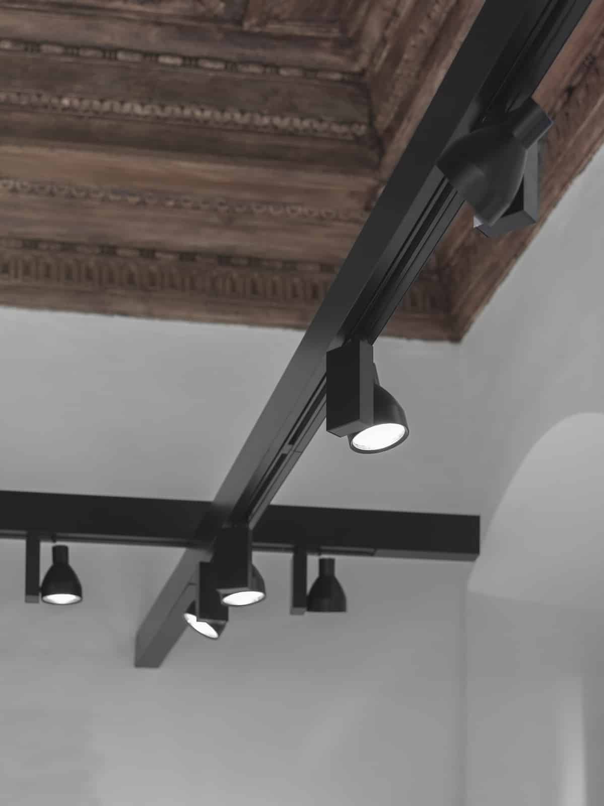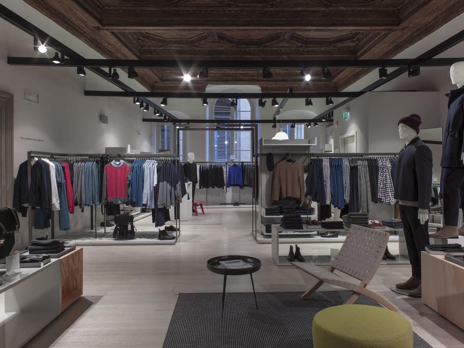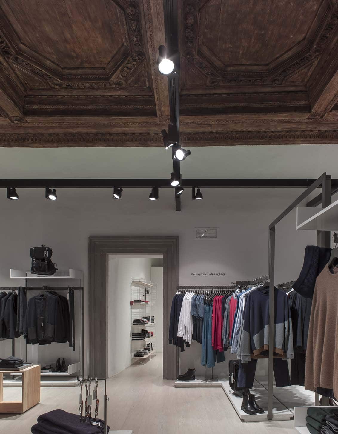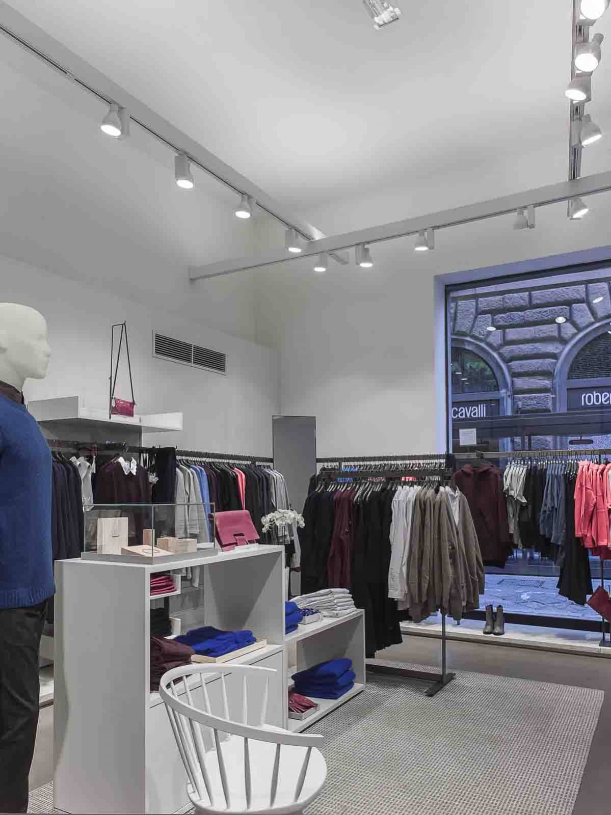 A settembre 2013 ha inaugurato nel pieno centro di Firenze, in via della Spada, il nuovo punto vendita COS, nuovo brand di “lusso” del gruppo svedese H&M. Il punto vendita è stato realizzato all’interno di un palazzo storico del 1600, fatto costruire da Robert Dudley, poi passato alla famiglia Navone, da cui oggi ne prende il nome. L’intero edificio è stato sottoposto a restauro, affidato ad un noto ed esperto architetto Fiorentino specializzato in queste opere. La sfida maggiore, all’interno dei locali del nuovo punto vendita, è stata quella di adattare e riprogettare il layout standard del brand alle aree e zone del palazzo storico, mantenendo assolutamente inalterate le caratteristiche e la bellezza delle strutture architettoniche del palazzo. Una delle difficoltà maggiori è stata quella di illuminare il negozio mantenendo lo stile del brand ma senza intaccare le pareti ed i soffitti degli ambienti, questi ultimi in parte a volta ed in parte cassettonati in legno. in riferimento a questa condizione, l’utilizzo degli apparecchi e sistemi illuminanti standard di fornitura H&M, costituiti essenzialmente da proiettori orientabili installati su blindoluce a sospensione, risultava non fattibile. Lavorando in sinergia con i referenti londinesi del brand si è cercato un sistema che permettesse di realizzare l’illuminazione del negozio il più possibile simile allo standard ma senza intaccare i soffitti. La soluzione era quella di creare delle strutture autoportanti con fissaggio strutturale alle sole pareti : una sorta di trave sul quale installare i proiettori orientabili tipici dei negozi di abbigliamento. Grazie all’azienda Bolognese Lucifero’s, produttrice di apparecchi e sistemi illuminanti di qualità ma soprattutto azienda in grado di seguire il committente e di creare prodotti ad oc per le esigenze dello stesso, si è riuscito, partendo da un prodotto “commerciale”, a trovare la perfetta soluzione alle esigenze di cui sopra. Come detto l’esigenza era quella di avere un binario elettrificato a servizio di appositi proiettori con lampada a scarica posizionabili liberamente a seconda delle esigenze commerciali (layout di vendita) e un sistema di illuminazione generale di tipo indiretto atto anche ad illuminare gli splendidi soffitti dei locali. Grazie al lavoro in sinergia con i tecnici di Lucifero’s, siamo riusciti a creare un sistema illuminante lineare totalmente privo di sospensioni o pendinature.Il sistema da noi scelto e proposto alla Committenza è il sistema FILE 2 H. Il sistema è costituito da un profilo in alluminio ad H con installato un binario elettrificato nella parte inferiore, a servizio dei proiettori, ed un sistema illuminante fluorescente a fila continua nella parte superiore. All’interno dello stesso profilo è inoltre possibile posare cavi elettrici e di segnale per la distribuzione impiantistica. Grazie ai Tecnici Lucifero’s si è riusciti a realizzare barre di lunghezza fino a 18mt totalmente prive di sospensioni, ottenendo così l’ottimo risultato voluto: illuminazione con proiettori a binario, illuminazione indiretta con un sistema a binario pertanto liberamente modificabile, ma totalmente privo di sospensioni. In riferimento alle diverse aree merceologiche del negozio si è optato per due diversi colori del sistema: nero nelle aree con soffitti a cassettoni in legno e bianco nelle aree con soffitti a volta bianchi.  Progetto impianti elettrici e progetto illuminotecnico:  Studio Sgargi Bologna