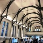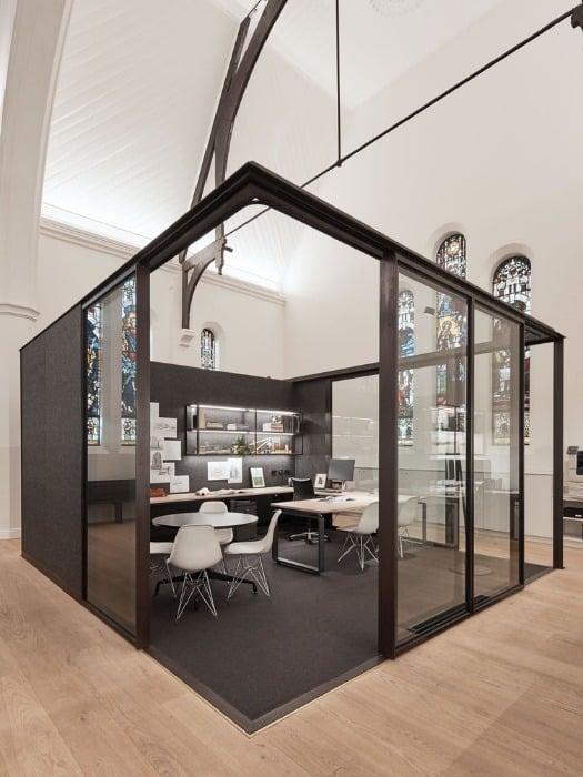 File2 sistema illumina il perimetro della navata centrale, ottenendo la più adatta illuminazione per il team di lavoro. I proiettori Phar sono stati utilizzati per dare risalto ai dettagli architetturali. Sopra all'altare un richiamo alla croce cristiana realizzata con Minifile.